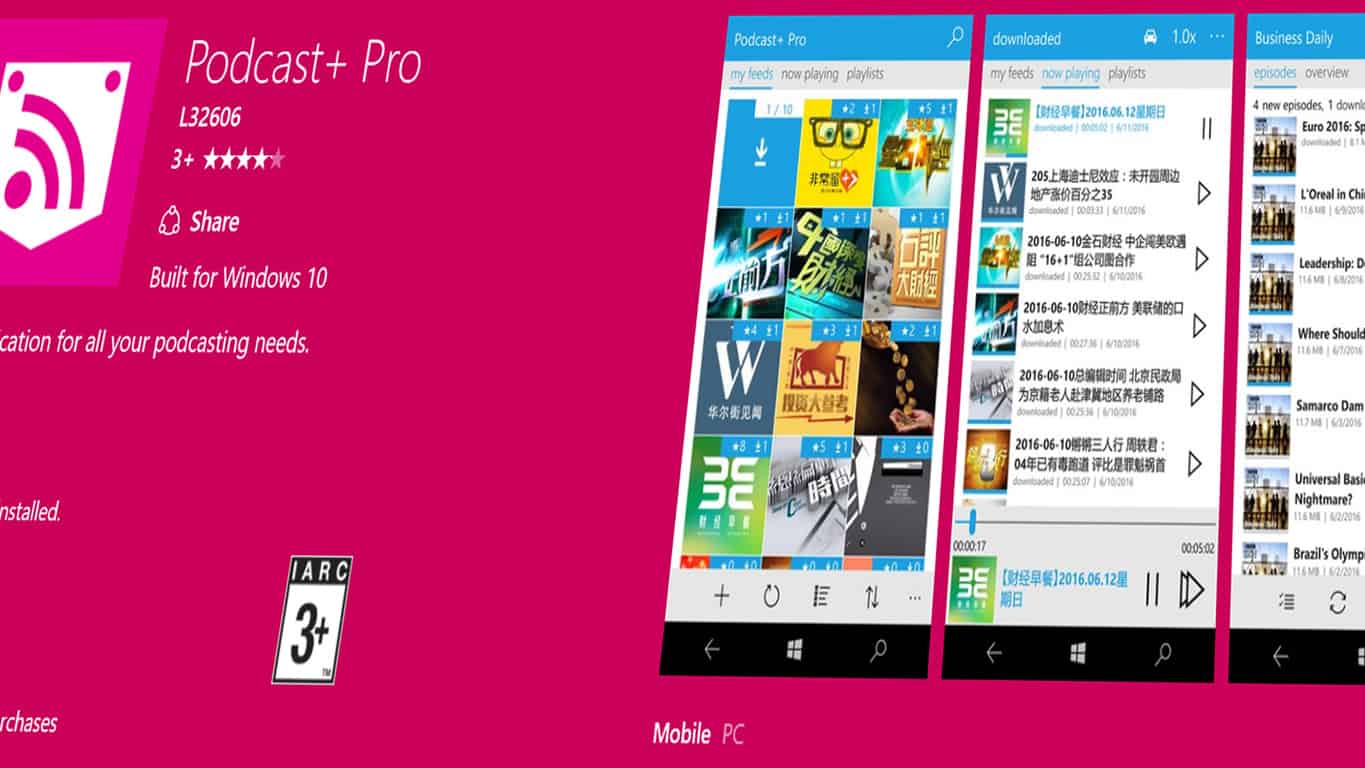 News Podcast+ Pro is now a UWP app The Podcast+ Pro app has just updated to version 6.0.2.0 and has now become an official Universal Windows Platform (UWP)… Brad Stephenson · June 16, 2016 · 1 min read