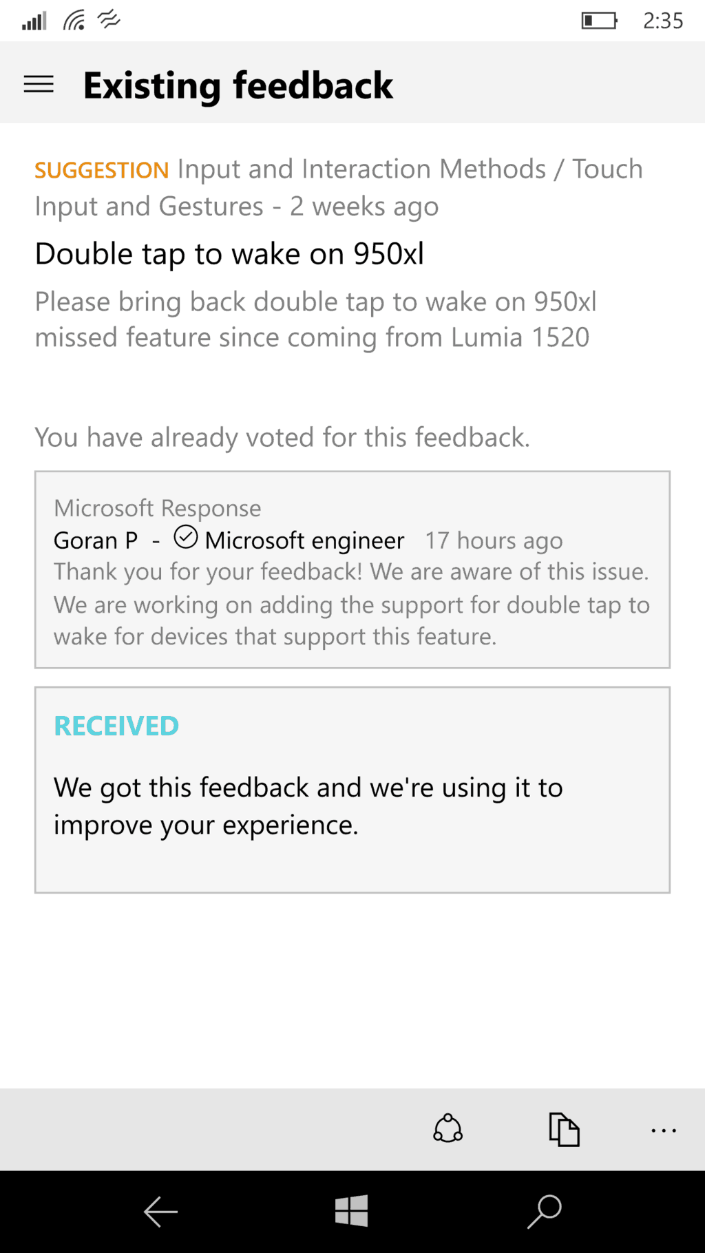 News Double Tap to Wake coming back to select Lumia devices by popular demand About a month back, we reported on how the “Double Tap to Wake” feature could come back to Lumia 950… Michael Cottuli · May 21, 2016 · 1 min read