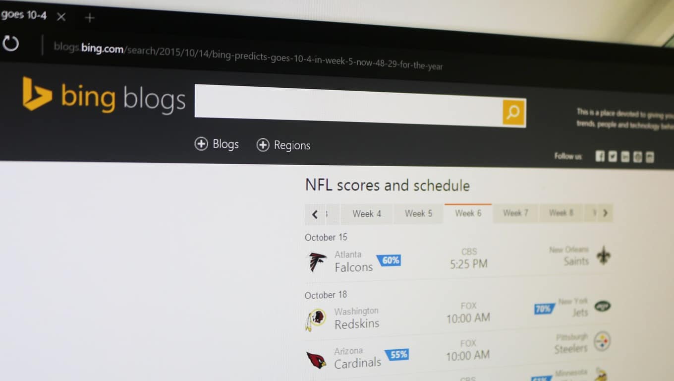 News Bing Predicts goes 10-4 in Week 5 of the NFL, predicting Seattle over Carolina in Week 6 It’s Wednesday, so it’s time for Bing’s weekly NFL predictions. Bing is not making any bold upset predictions when compared… Kellogg Brengel · October 14, 2015 · 2 min read