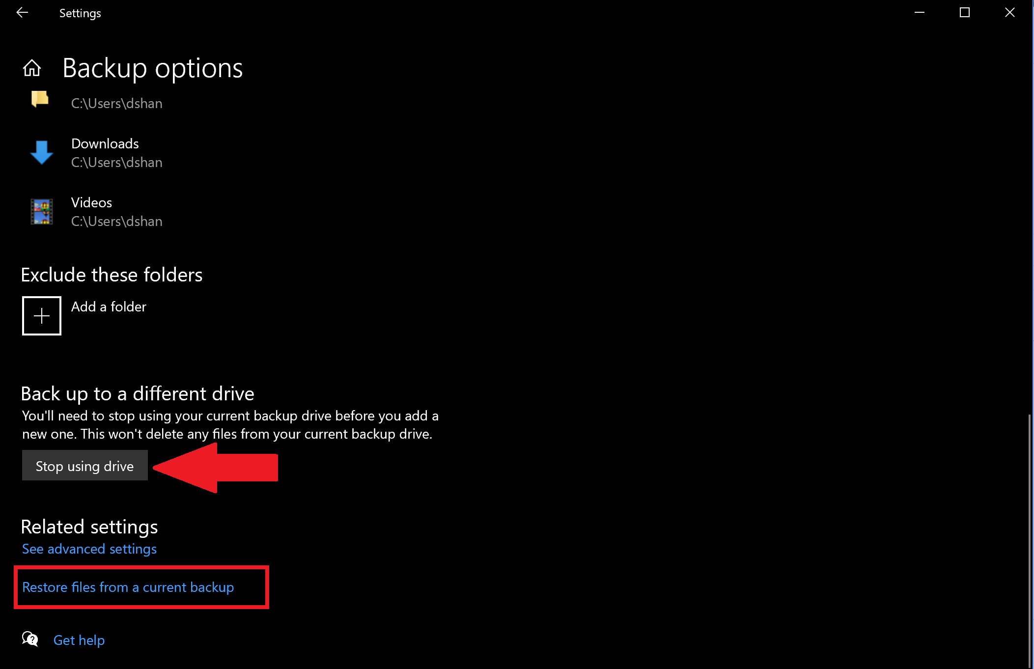 You are also not limited to just individual files, you can also restore whole folders if necessary. If you want to backup to another different drive, or create a different backup, you need to click Stop using drive. This will stop the current backup and you can now save a new backup to a new USB or network drive.