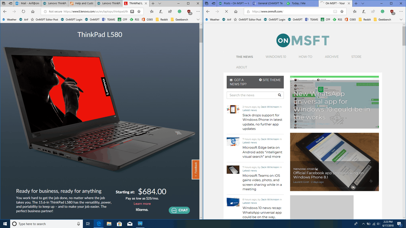 Even though the build and design might not feel so premium, the IPS display is excellent and makes up for everything else. The display on the L580 reminds me a lot of a version of the display on the ThinkPad X1 Carbon, in that it is bright and fluent (with 250 nits of brightness.) The viewing angles (up to 175 degrees) are excellent and there is plenty of room for multi-tasking. I was easily able to stack windows side by side and get a lot of work done without hooking up to an external monitor. All in all, a 15-inch display is awesome, especially if you’re always on the road or traveling without monitors. It’s definitely the highlight of this laptop and a key reason I think it should be chosen over the smaller L480 or L380 models.