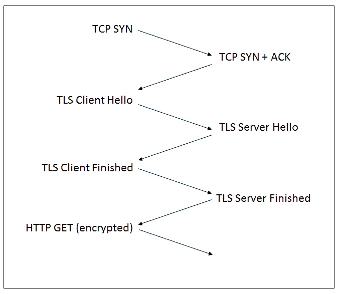To understand the handshake between a server and a client, take a look at the diagram below. With 3 RTT, the current TLS requires the initial Client and Server Communication to begin and finish before encrypted data can be communicated between the two.